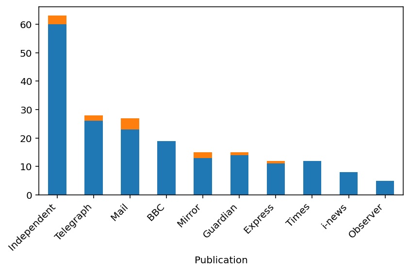 This identified a total of 19 BBC reports and 185 newspaper articles (print and online, but excluding letters). Of these 204 reports, only 13 (that’s 6.4%) mentioned Epstein. Below is a breakdown of these news items by publication (combining print and online and weeklies with Sundays). The articles mentioning Epstein are in orange and the rest in blue.