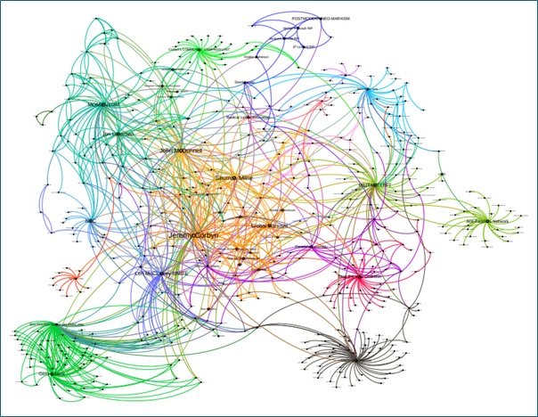One weakness of network analysis is its empiricism. It’s very good at representing easily classifiable connections between things that give rise to a structure of relations. But there’s a lot of complexity – especially when it comes to humans – that it cannot readily capture. If you want to assert there’s something called ‘Post Modern Neo-Marxism’ then go for it. Knock yourself out. But it isn’t a ‘thing’ that belongs in a network. The great left-Weberian historical sociologist Michael Mann once responded to a study representing the state as a network of policy actors like this: